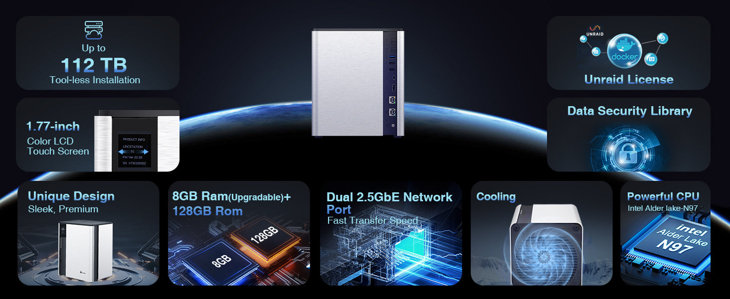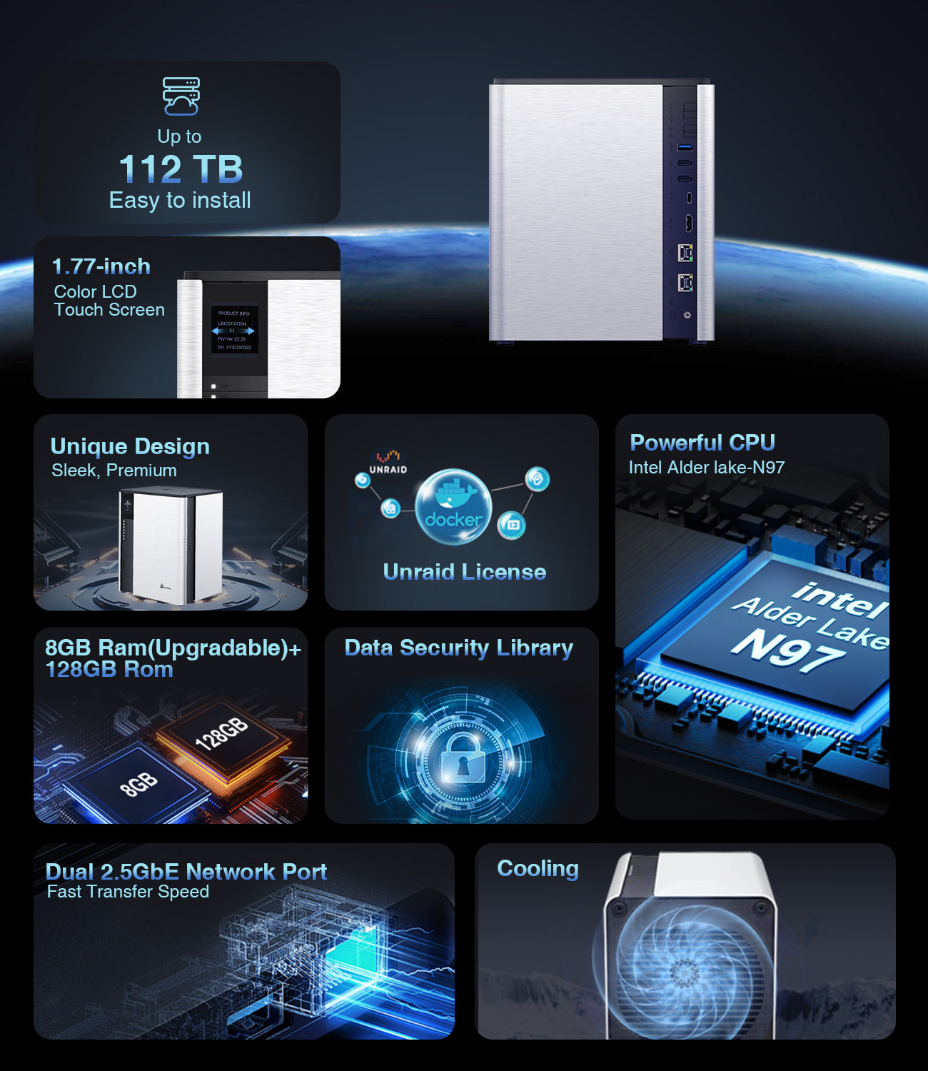 - The nas server is equipped with Intel Alder Lake N97 CPU. 7nm lithography, 4-cores, 8GB memory, 128GB ROM , 2.00 GHz base frequency, 3.60 GHz burst frequency. Powered by Unraid starter version system.