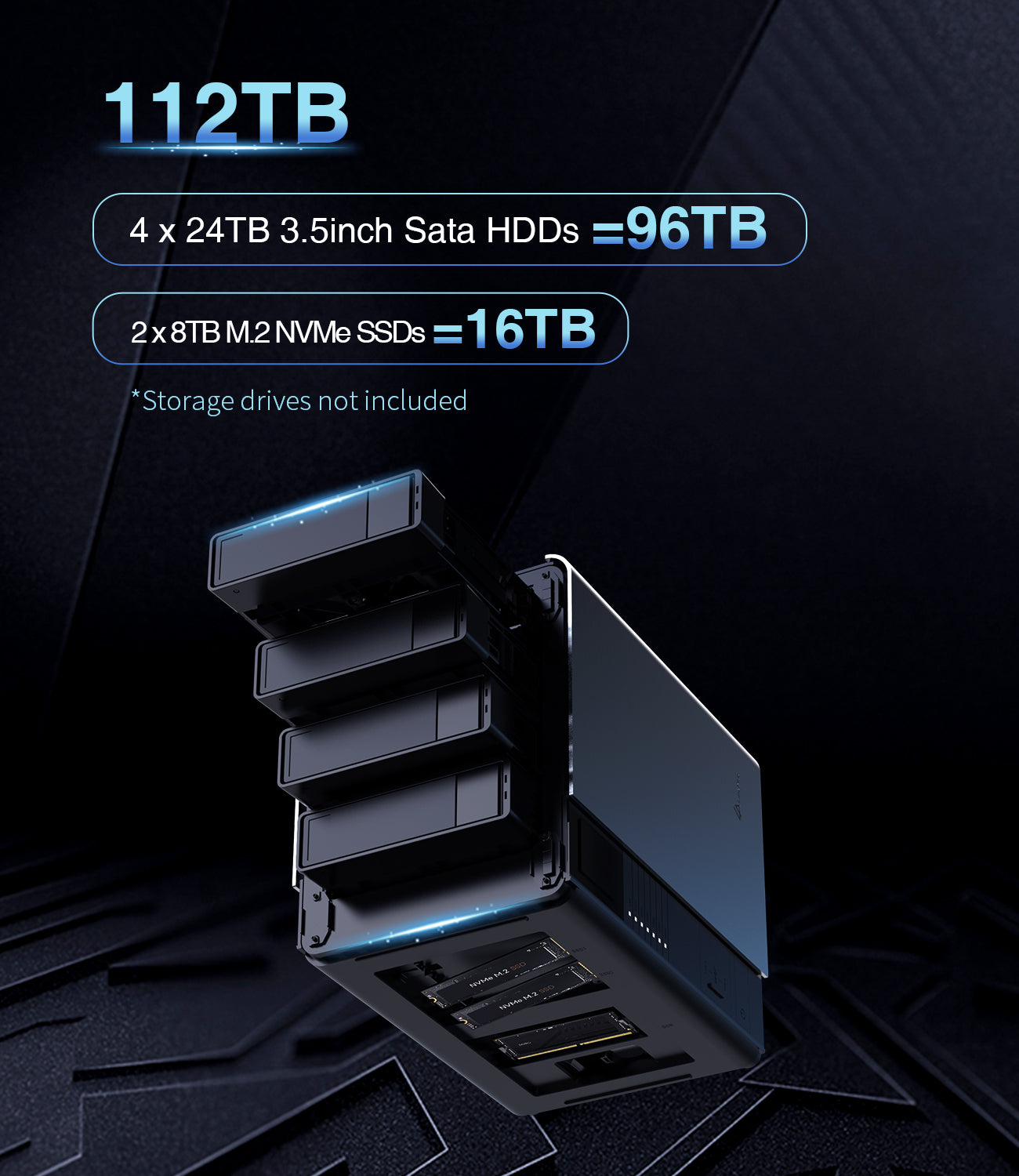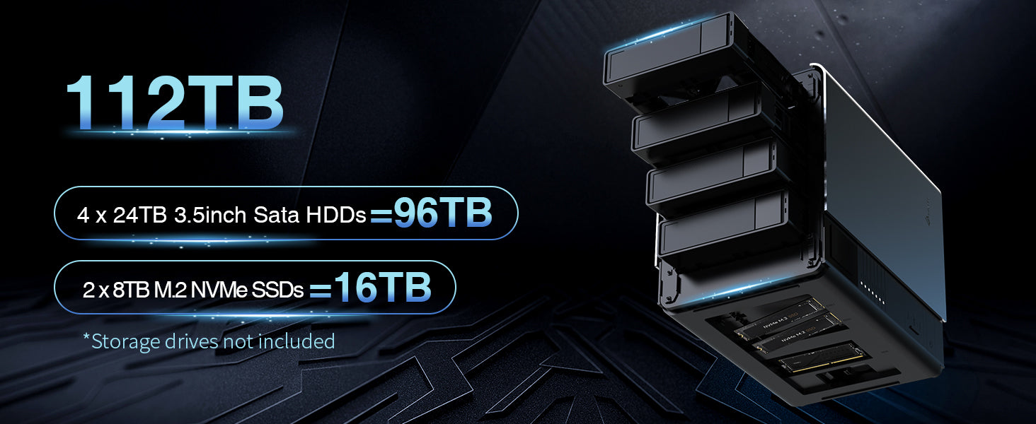 4X24TB 3.5-inch SATA HDDS + 2X8TB M.2 NVMe SSDs = 112TB
