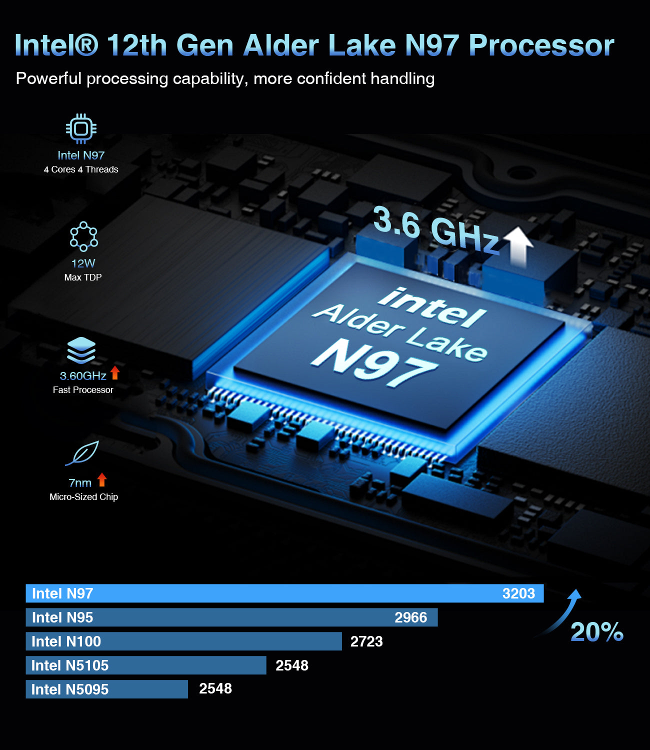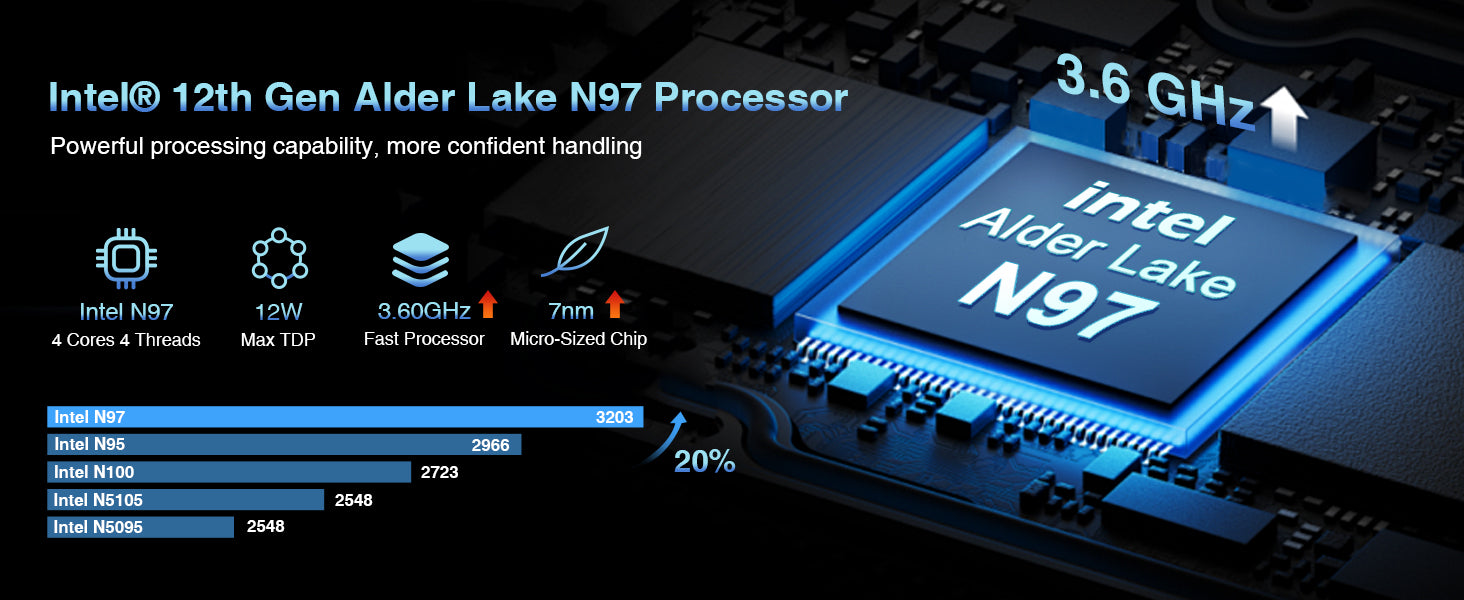 CPU: Intel Alder lake-N N97, 4 cores 4 threads, up to 3.6 GHz, TDP 12W