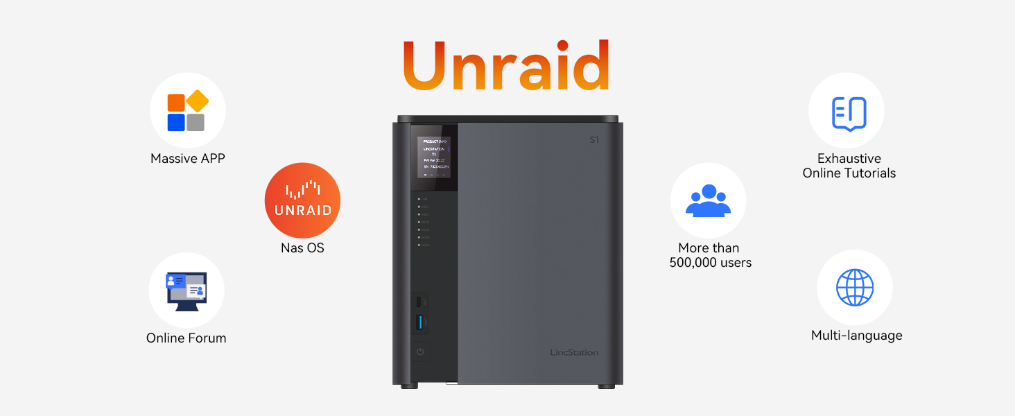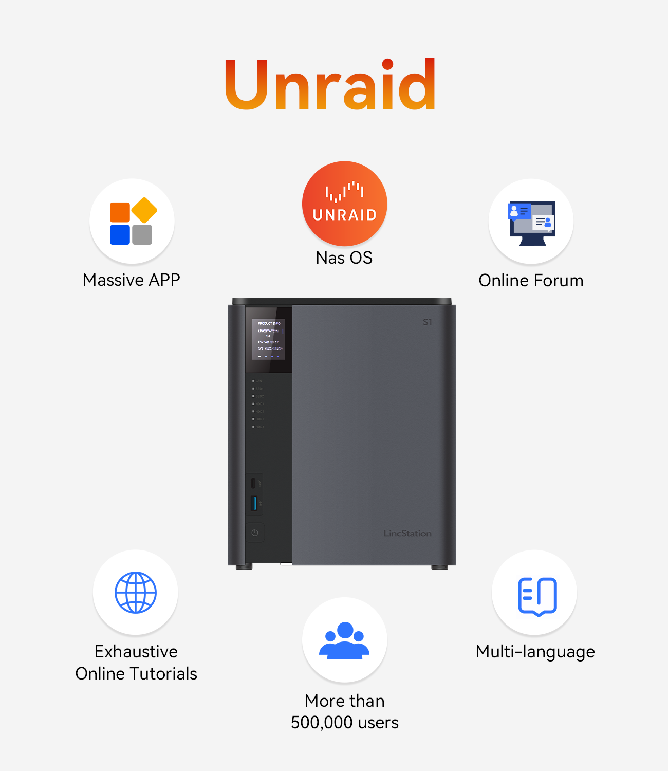 The LincStation S1 comes pre-installed with Unraid OS. With access to more than 2400 apps—ranging from media servers to