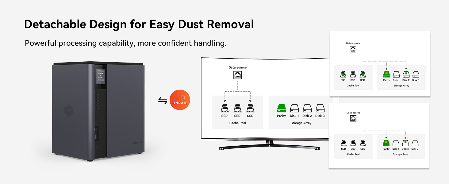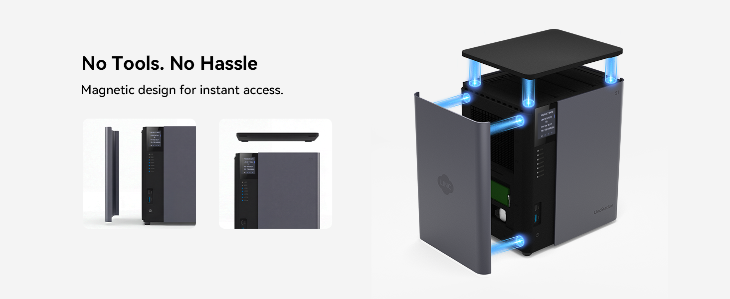 LincStation S1 features a unique tool-free design, allowing you to install or swap drives effortlessly—no screwdriver required.