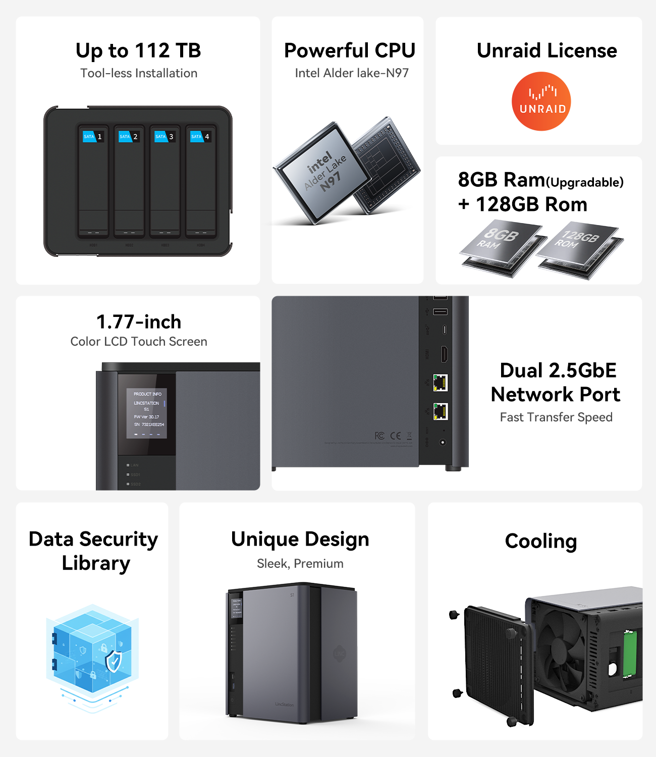 - The nas server is equipped with Intel Alder Lake N97 CPU. 7nm lithography, 4-cores, 8GB memory, 128GB ROM , 2.00 GHz base frequency, 3.60 GHz burst frequency. Powered by Unraid starter version system.