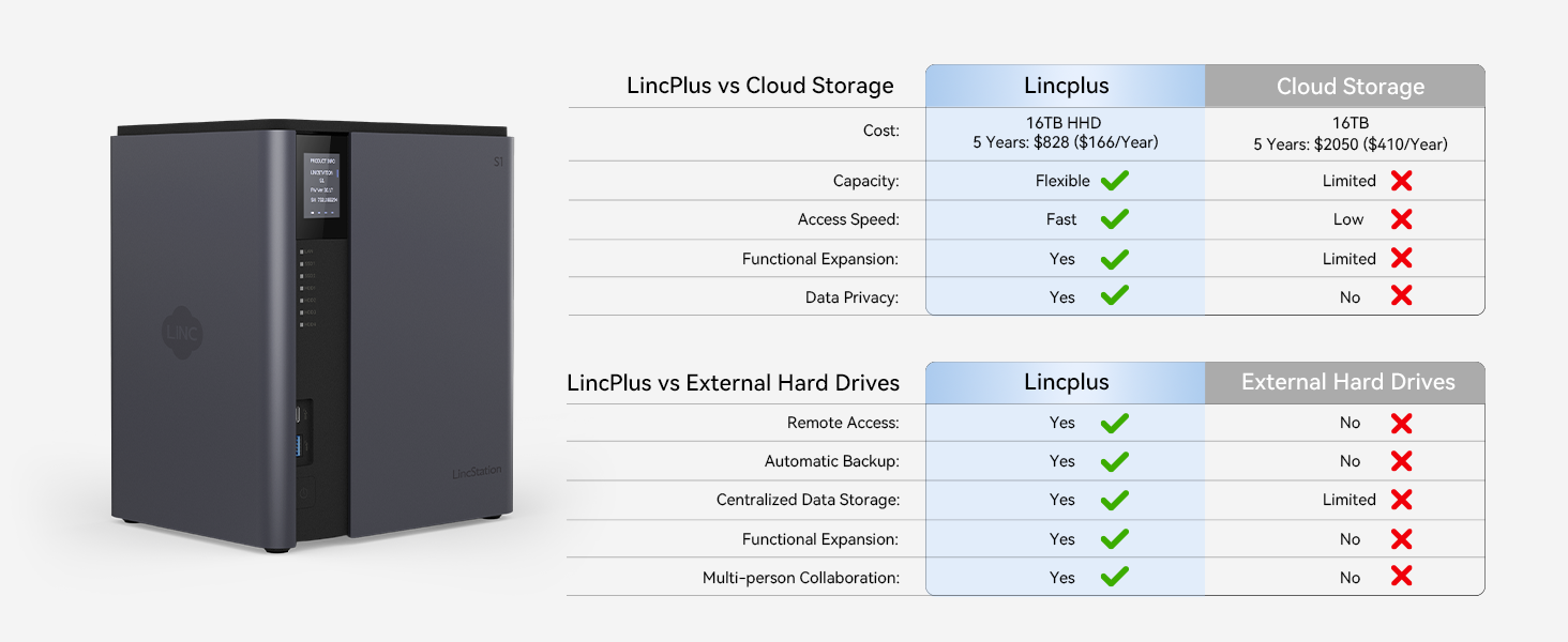 LincStation S1 gives you full control over your data with no monthly fees, offering always-on storage. Unlike cloud services