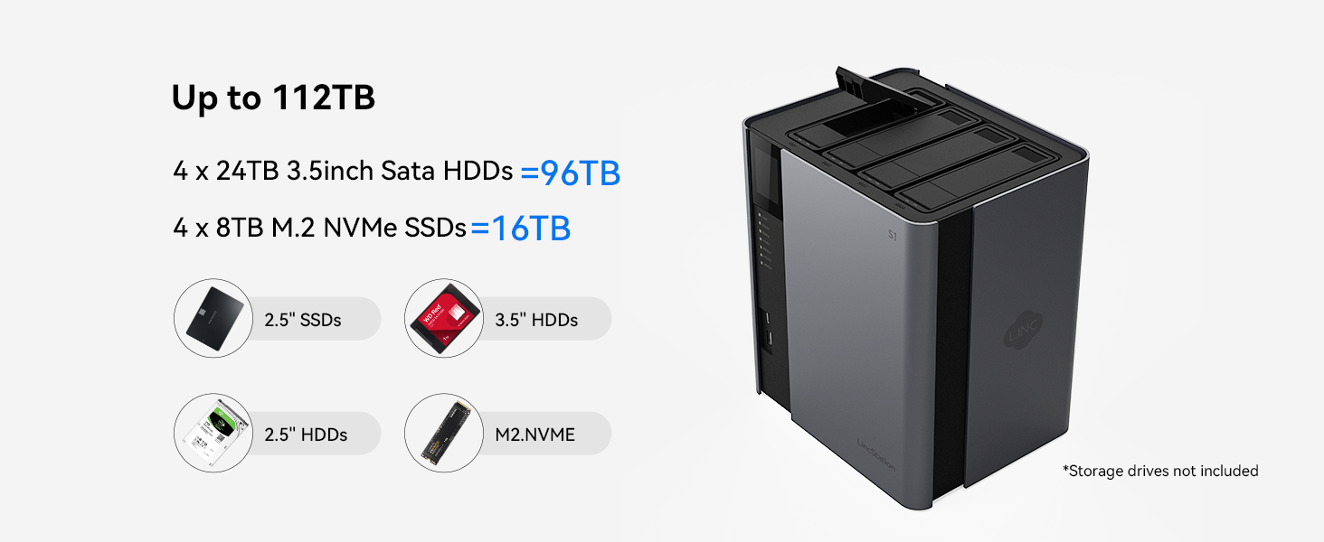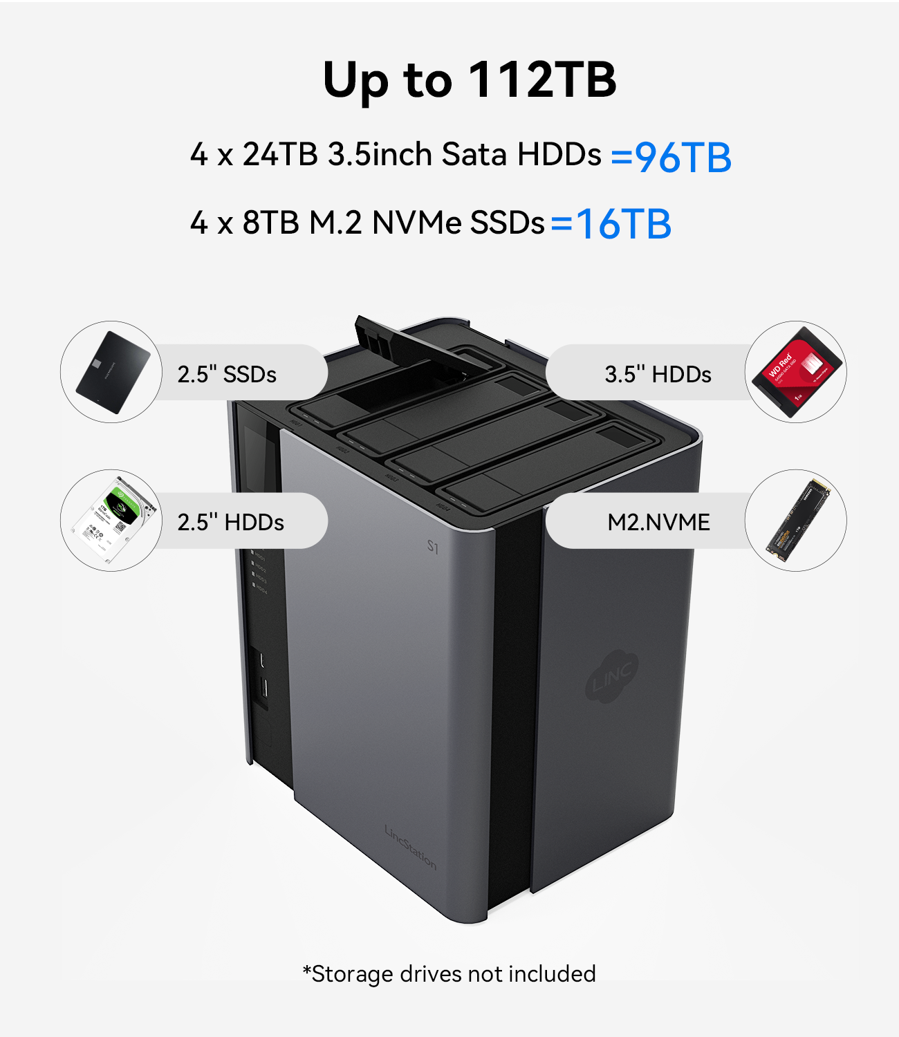 Built for serious storage needs, the LincStation S1 supports up to four 2.5" or 3.5" SATA HDDs and two NVMe SSDs, delivering a total