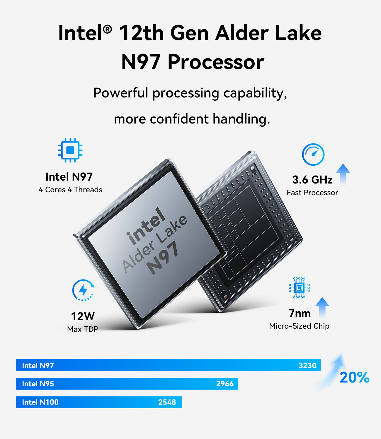 CPU: Intel Alder lake-N N97, 4 cores 4 threads, up to 3.6 GHz, TDP 12W