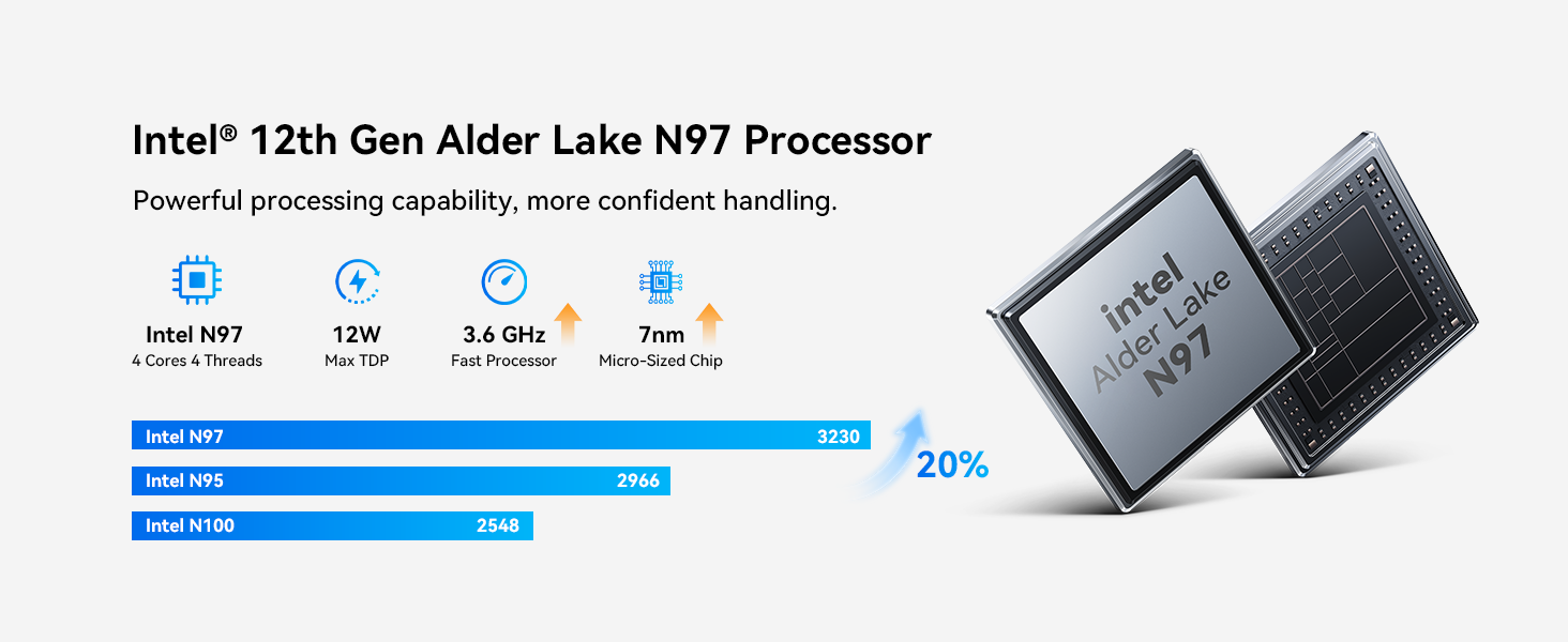 With higher base and turbo frequencies, the N97 ensures faster app loading, smoother multitasking, and improved
