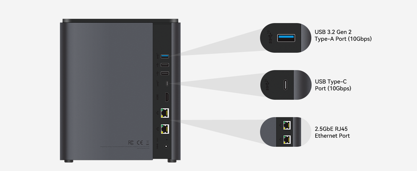 - The rich interface provides users with more possibilities. Everything you need is integrated in this 6 bay nas storage. 2 Bay PCIe M.2 2280(M.2 NVME) SSD Slot, 4 Bay 3.5 inch SATA SSD Slot. 2.5G Ethernet Port x2, USB C Port x1, 3.5 Audio Port x1, HDMI 2.0 x1, USB 3.2gen2 x2, USB 2.0 Type-A x 2.