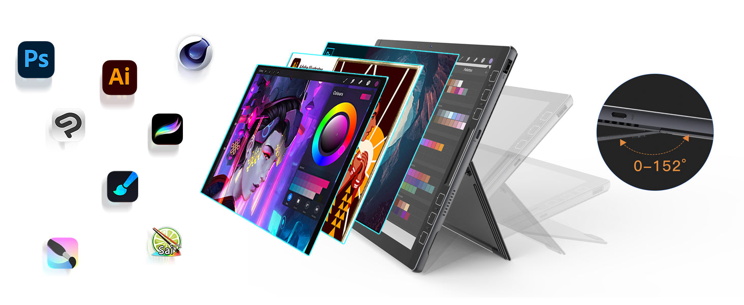 The LincStudio is an all-in-one creator tablet. It comes with an Intel Core i7 processor, Windows 11 OS, a Wacom EMR pen, a 2K display, 12 custom shortcut keys, a detachable keyboard, and a built-in stand.