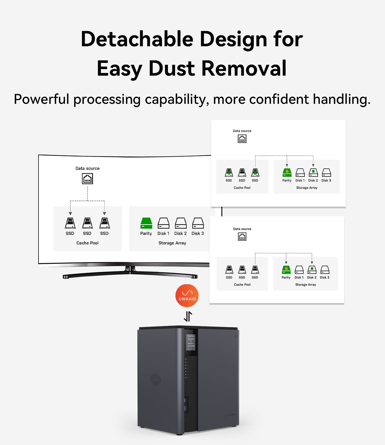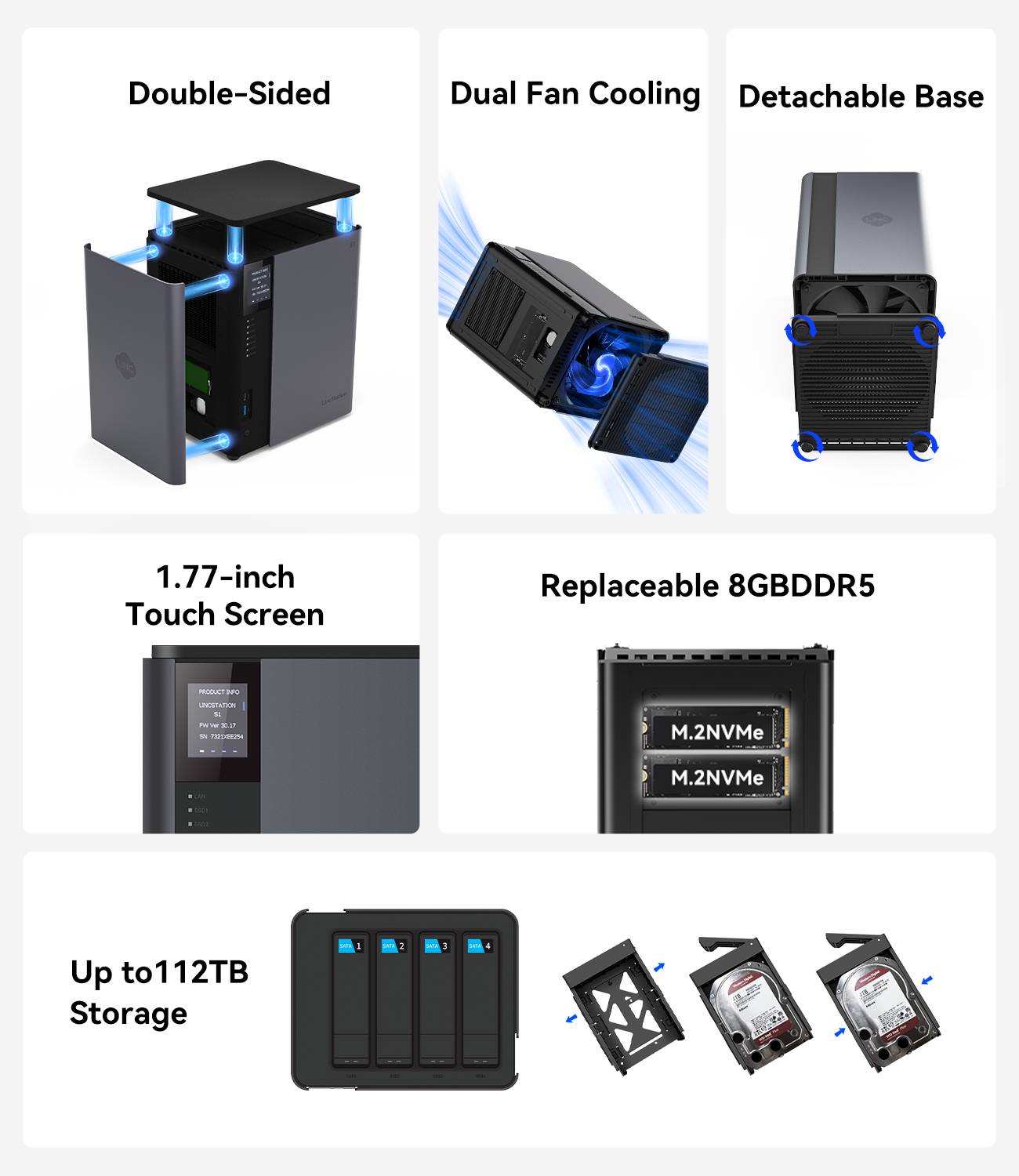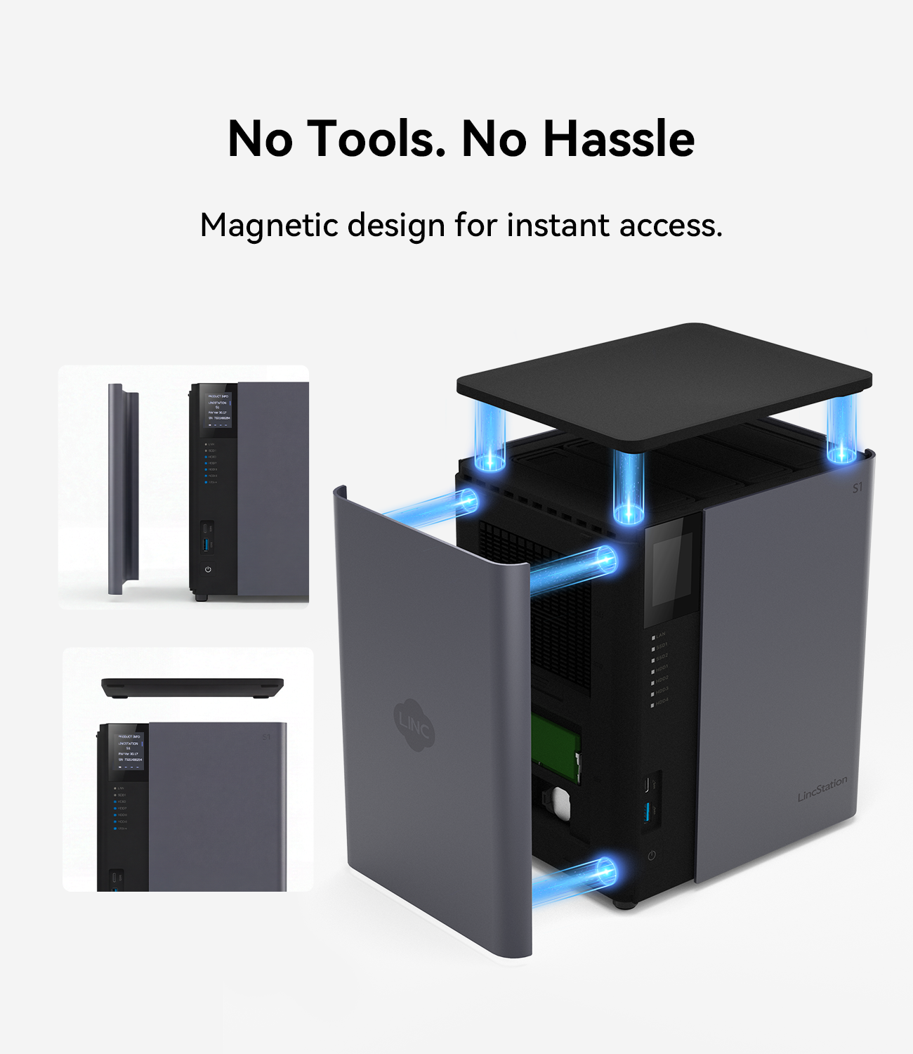 LincStation S1 features a unique tool-free design, allowing you to install or swap drives effortlessly—no screwdriver required.