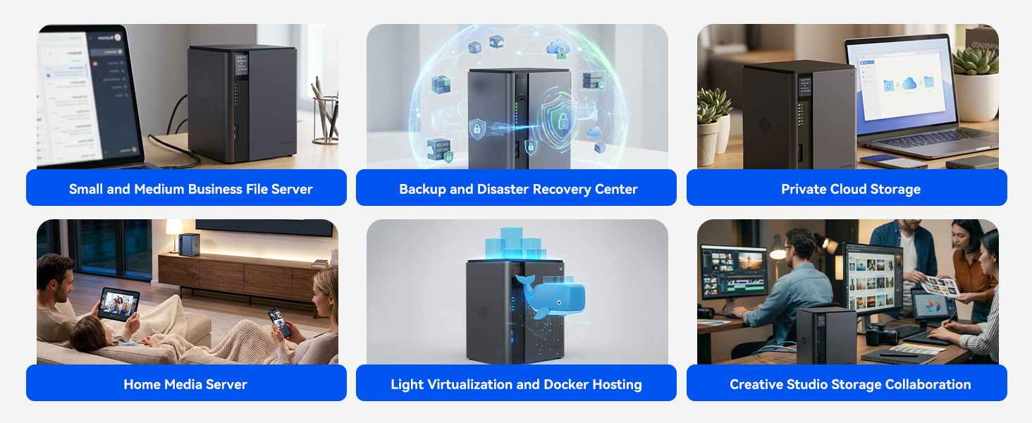 • This nas storage supports full-featured docker and virtualization, comes with Unraid License. One-click deployment and installation of the docker application suite. Support to build virtual machines in the system, install Android, Linux, Windows, and support hardware pass-through (Unraid version). LincStation NAS is not only your network attached storage, but also a powerful private cloud and home server.