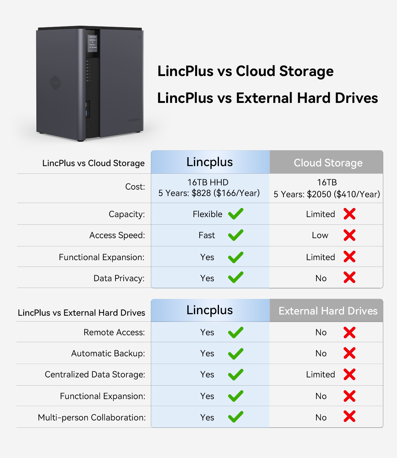 LincStation S1 gives you full control over your data with no monthly fees, offering always-on storage. Unlike cloud services