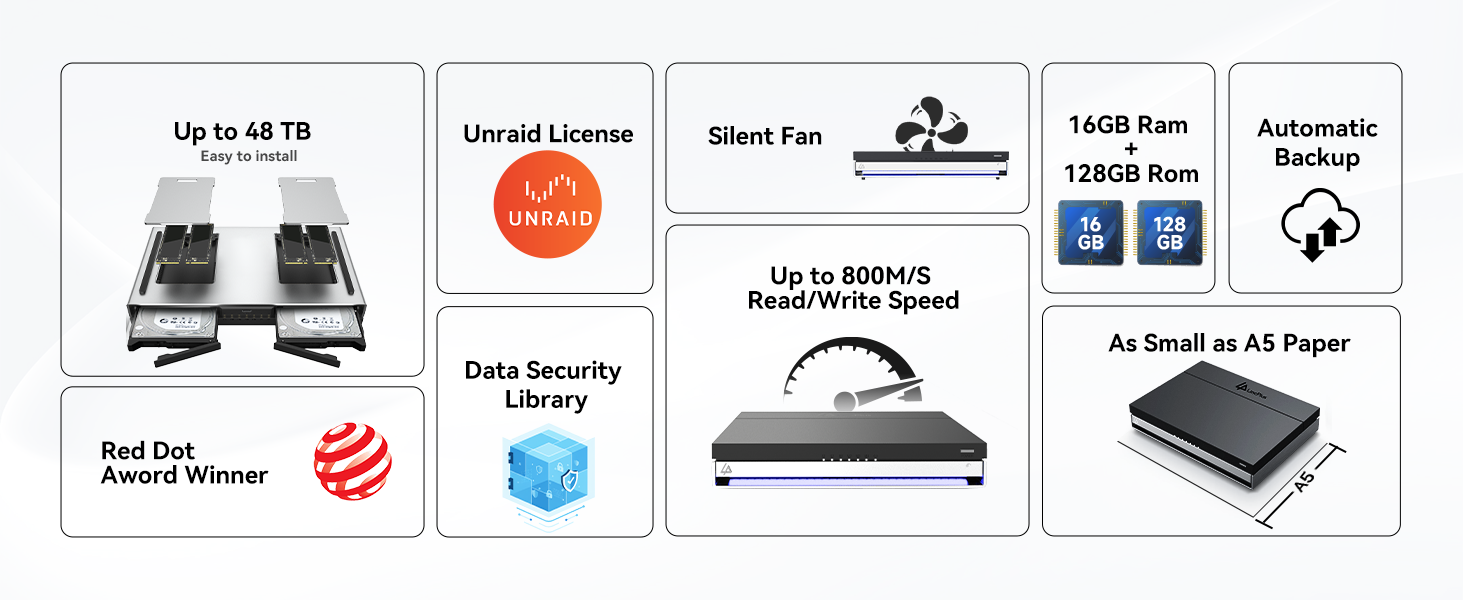 - Our network attached storage adopts unraid disk array, even if one disk is damaged, it will not cause data loss, which can guarantee the user's data security to the greatest extent. Supports automatic backup, remote download, intelligent photo albums, music playback, and intelligent partition.
