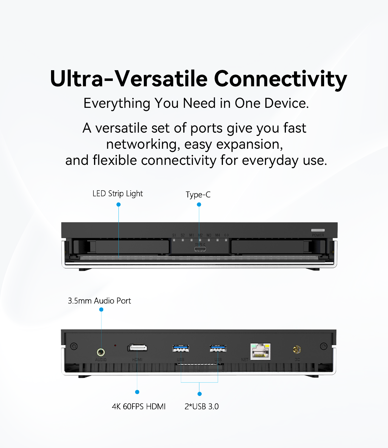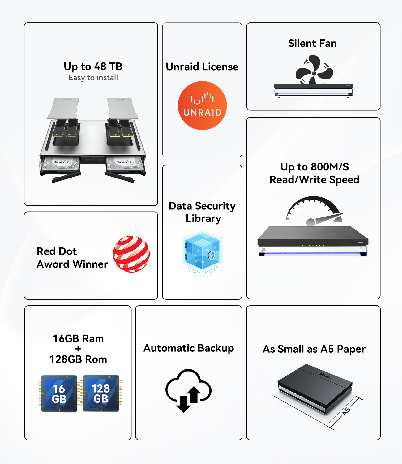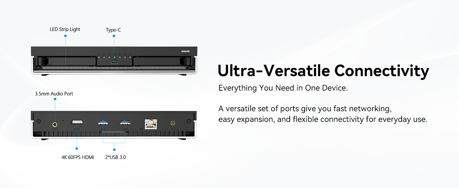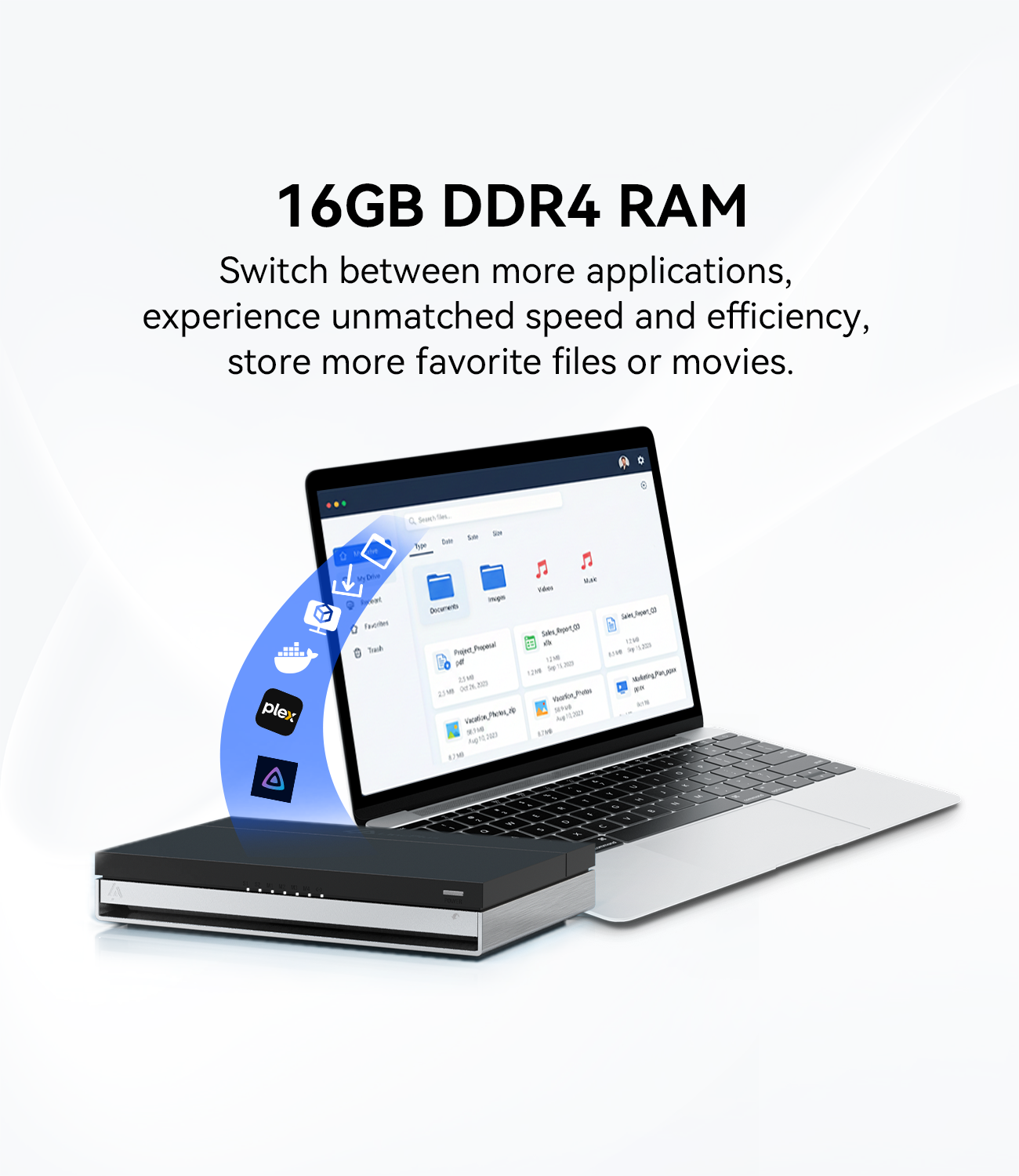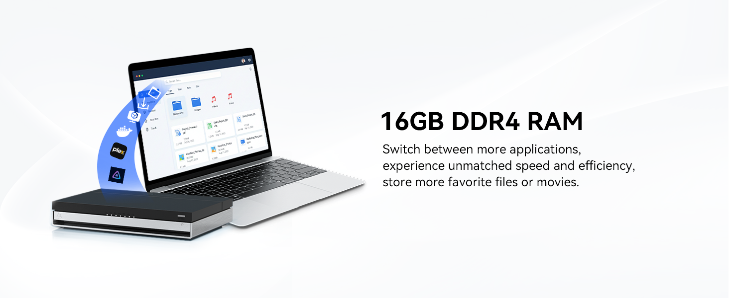 on-board LPDDR5 16GB RAM and 128GB eMMC storage.it also supports installing other NAS systems like TrueNAS,