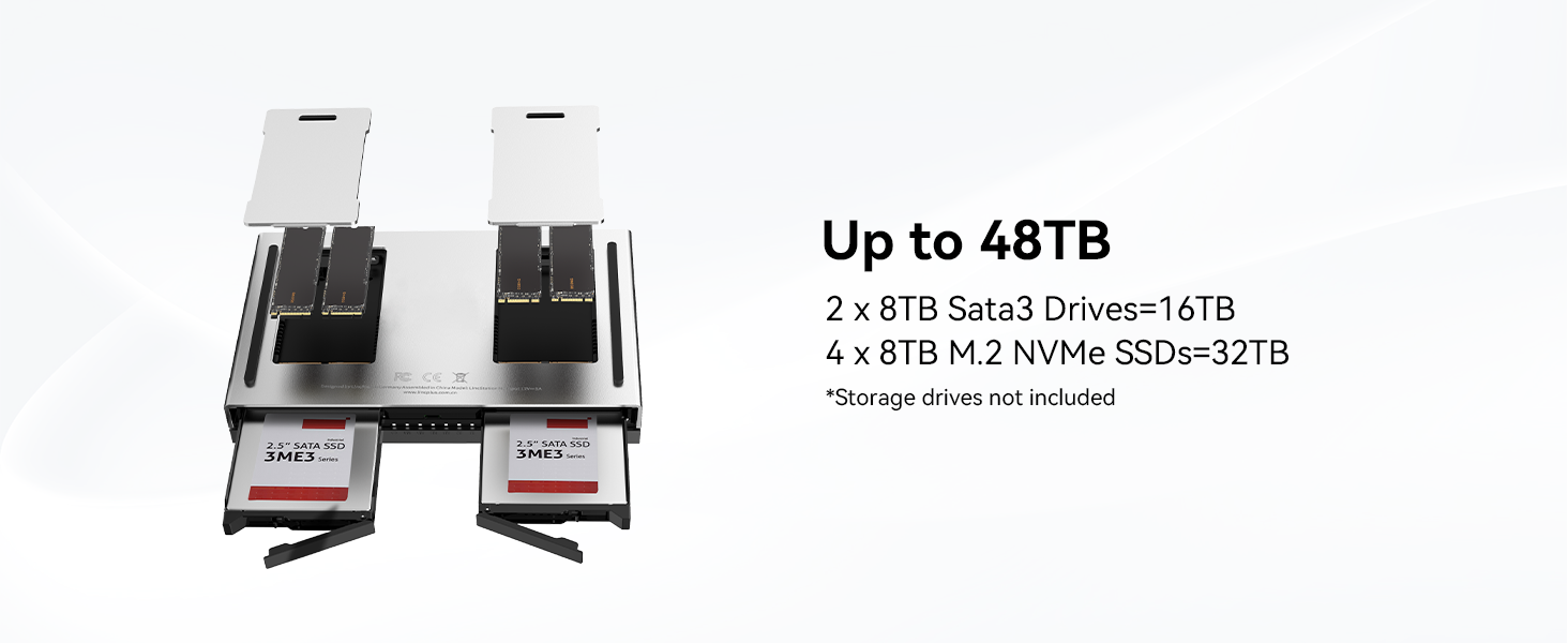 Can use 2.5-inch sata3 interface hdd or ssd, or 2280 specification nvme hard disk. The bay has a height limitation-9.5mm, it can support SATA HDDs that is thiner than 9.5mm.